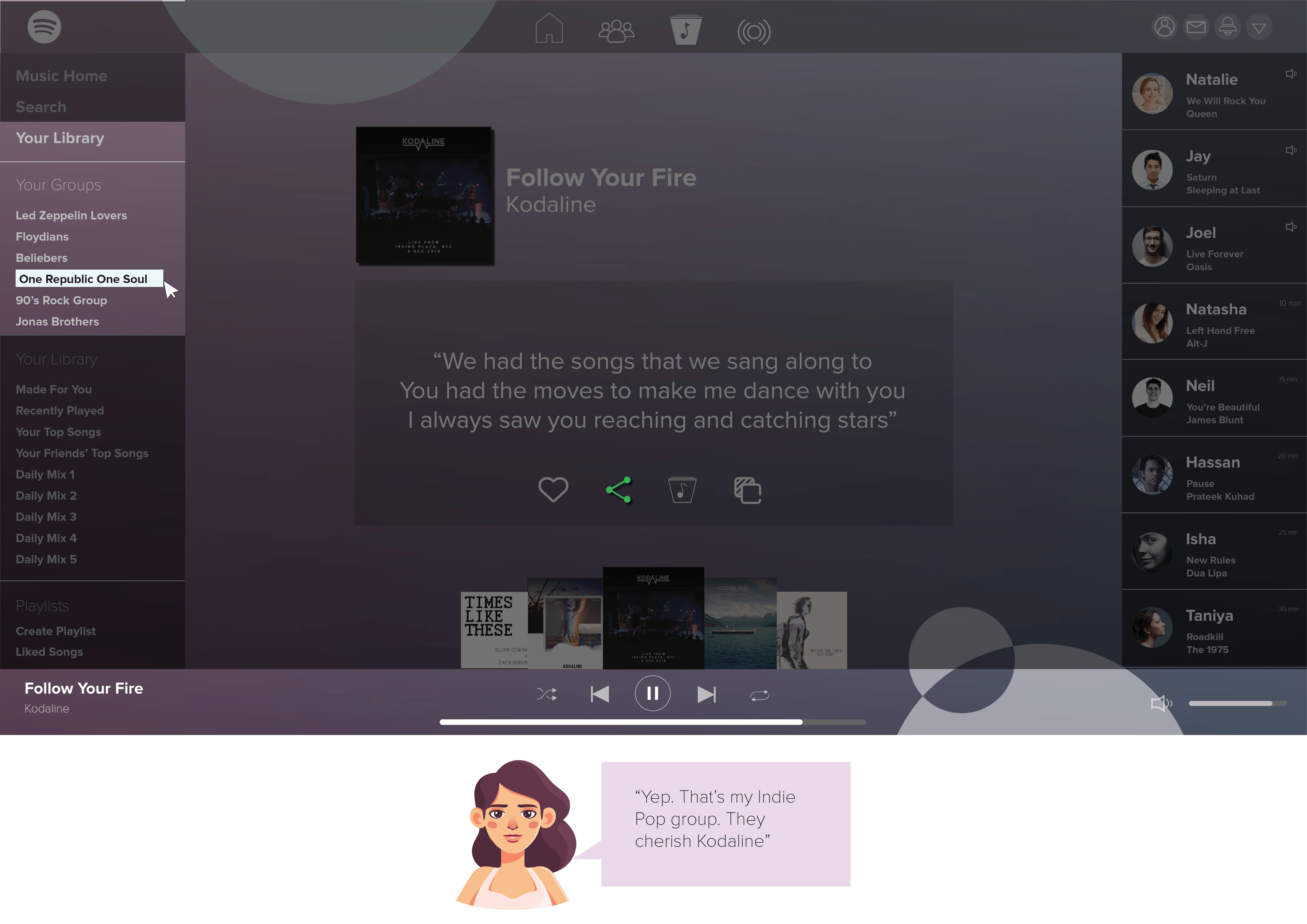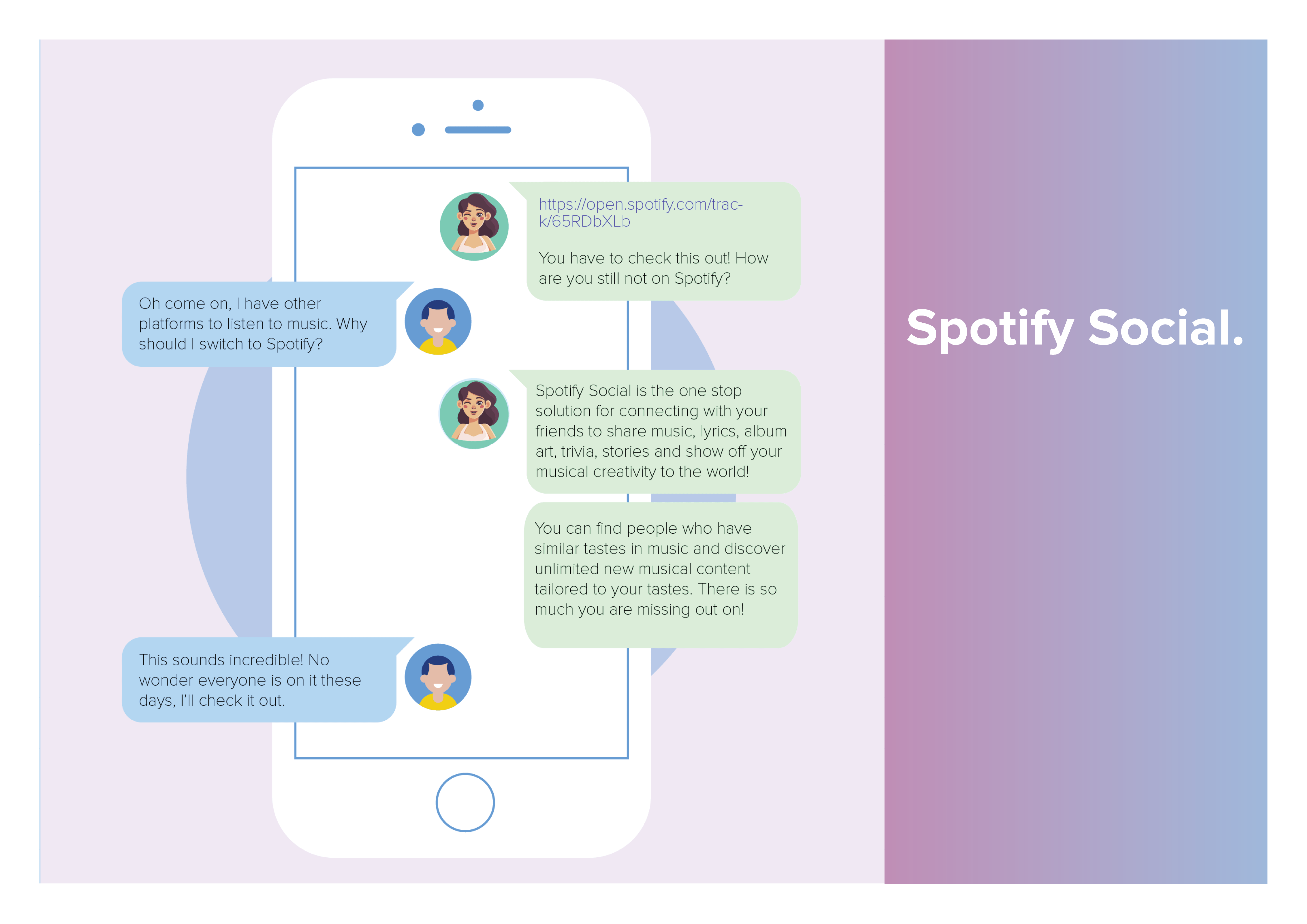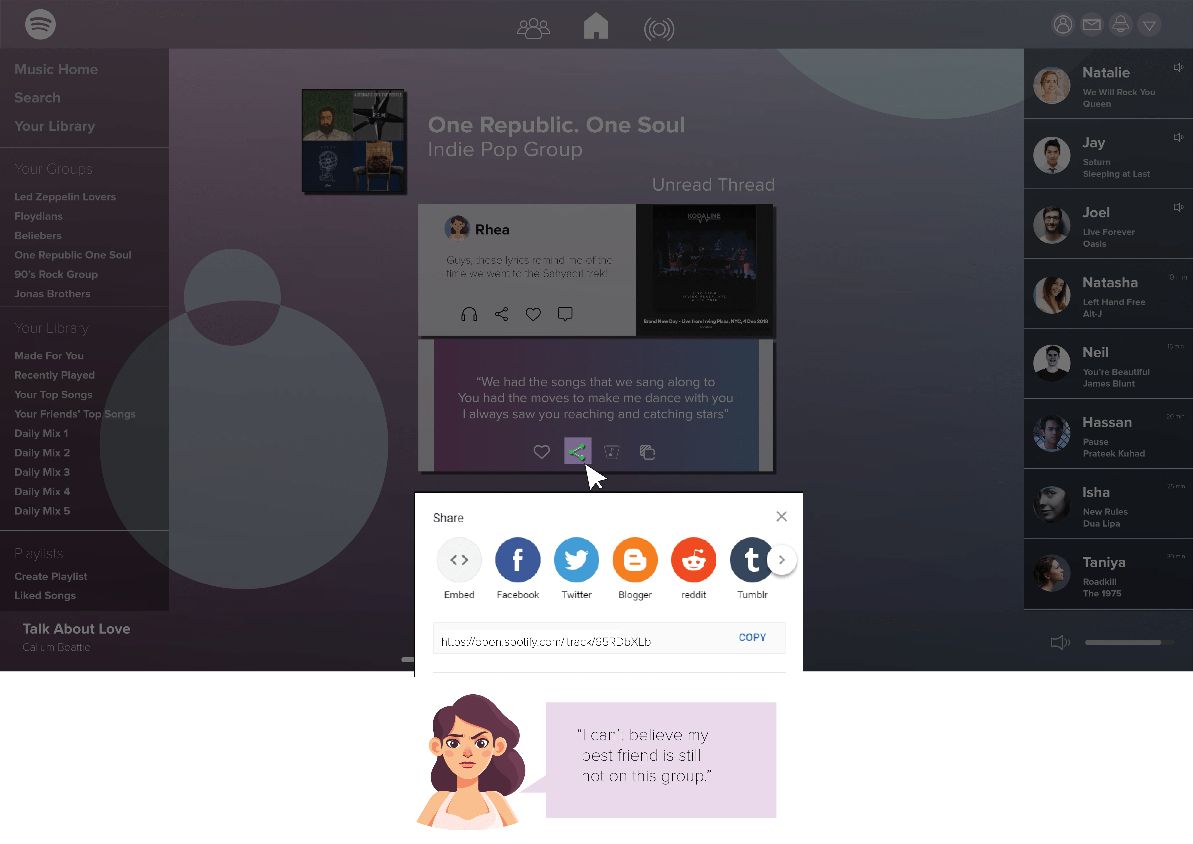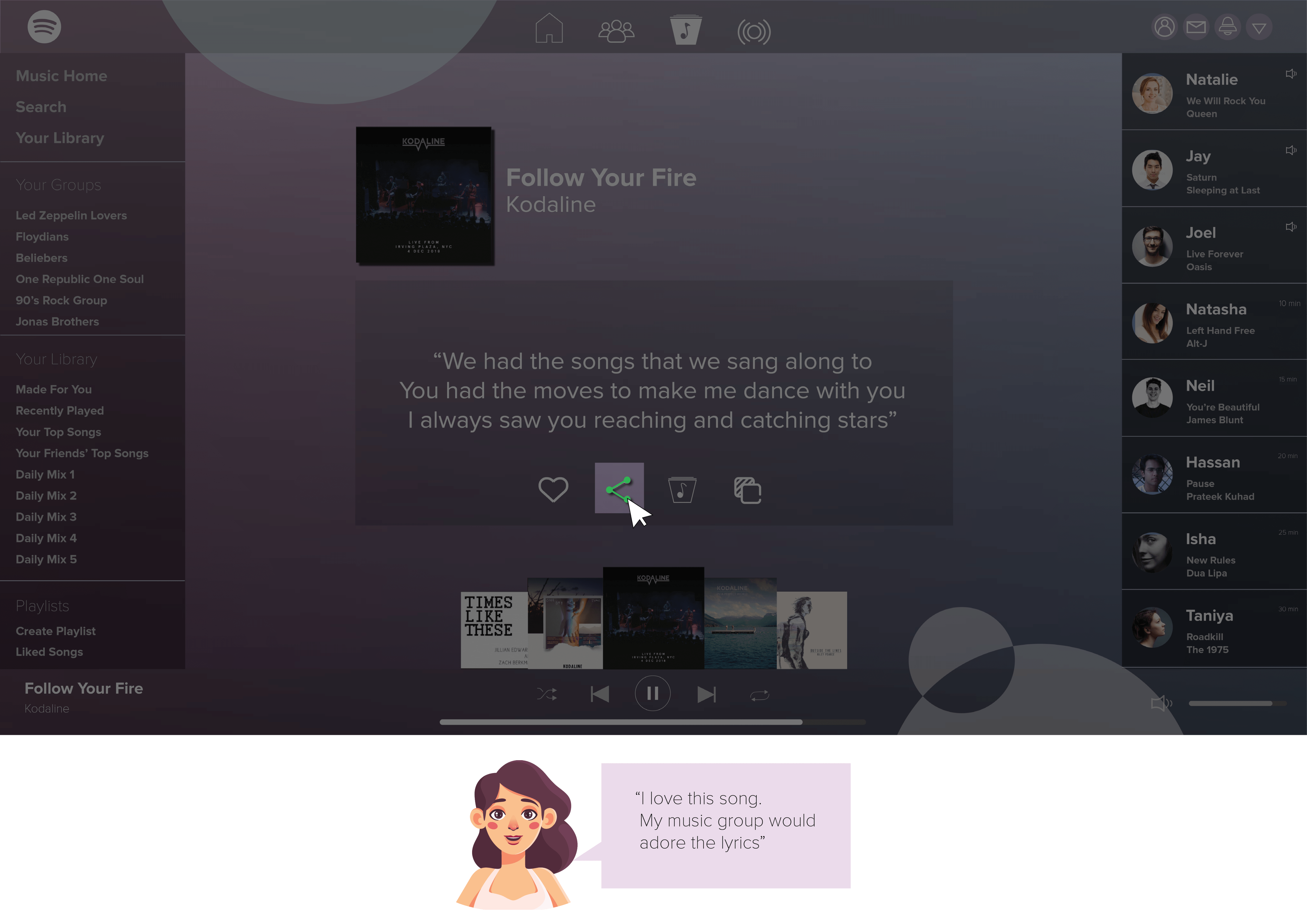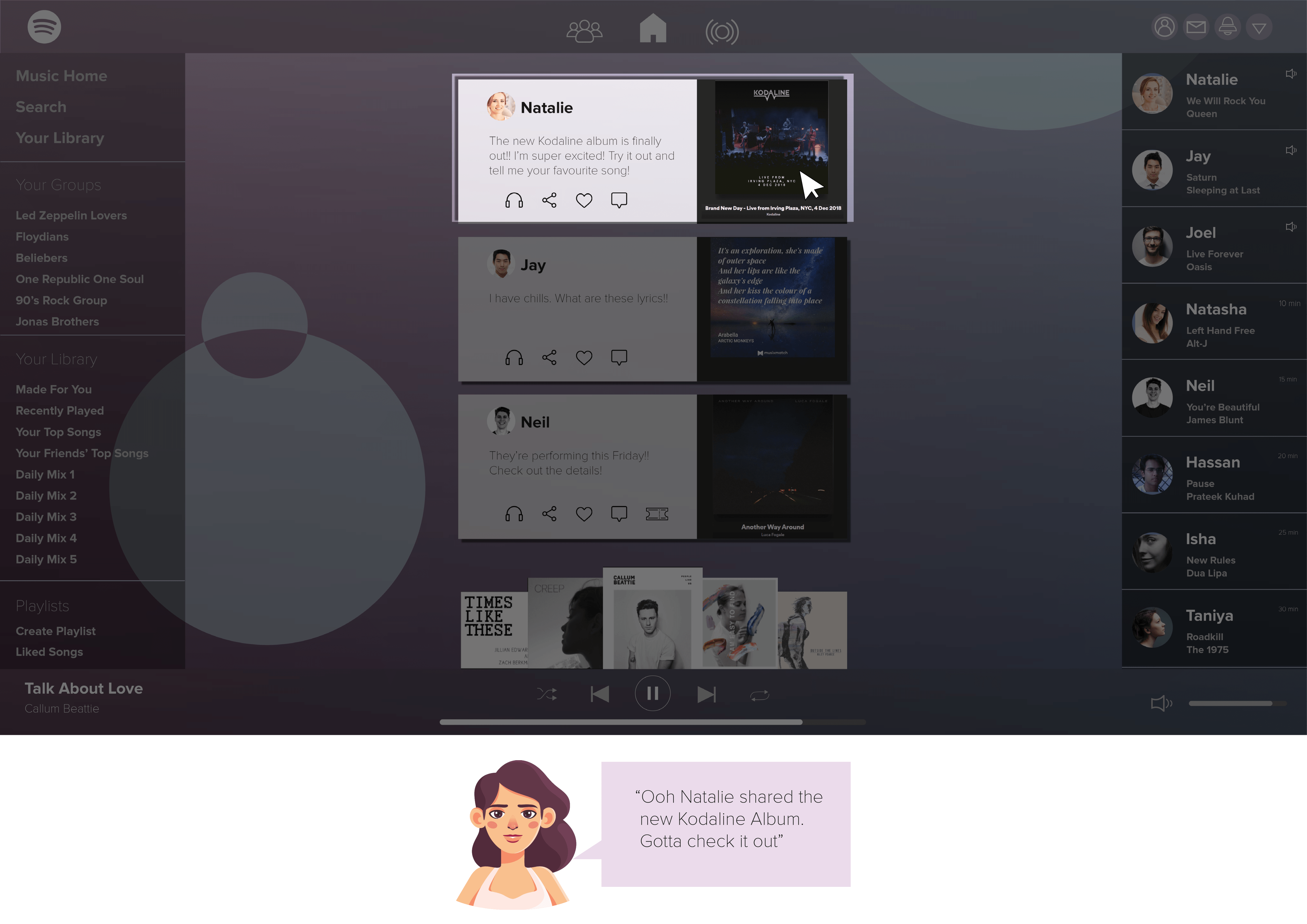 Creating social media-like features such as spotify user-feeds, spotify stories, spotify social groups, spotify messaging, lyric sharing, trivia sharing and so on