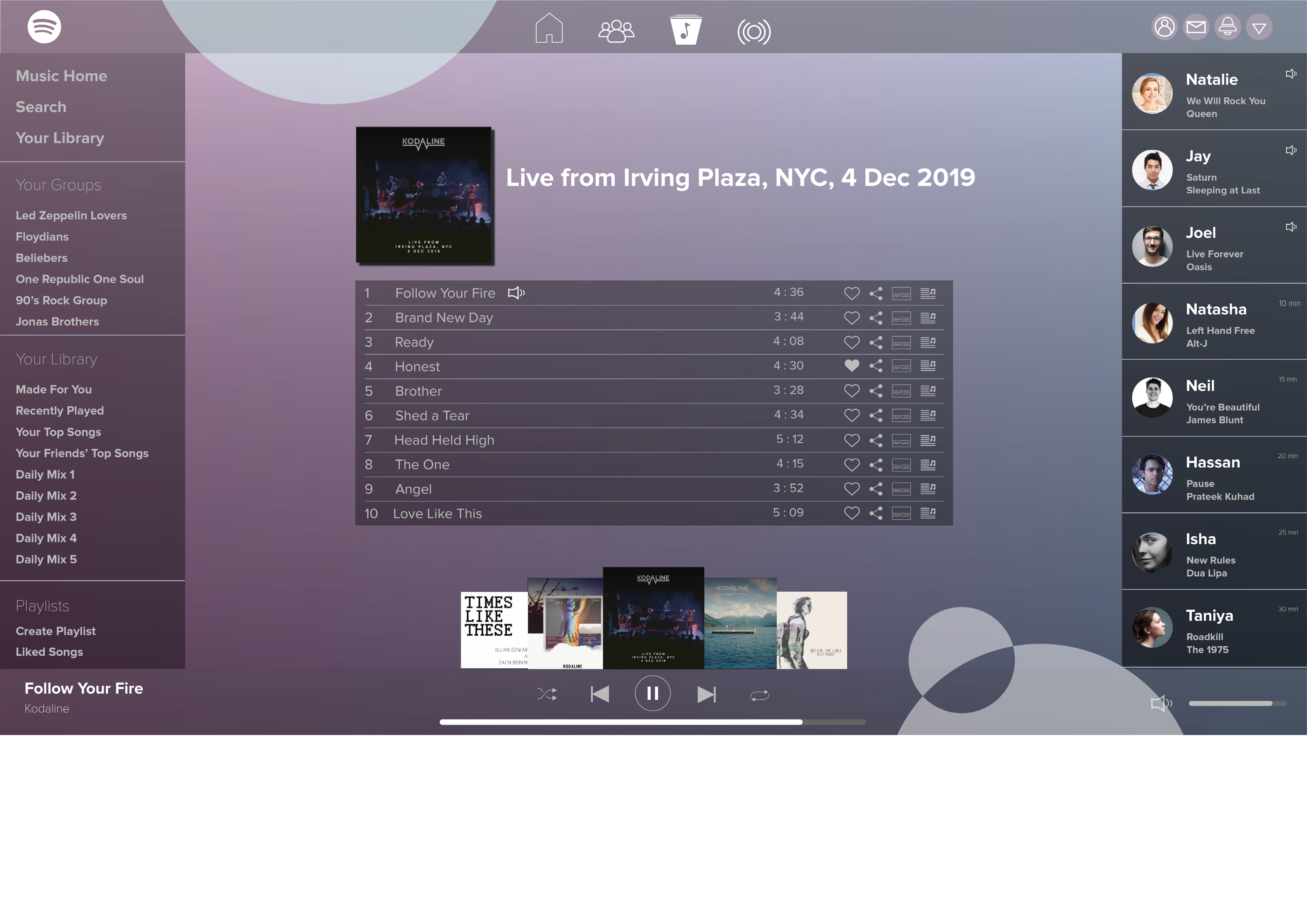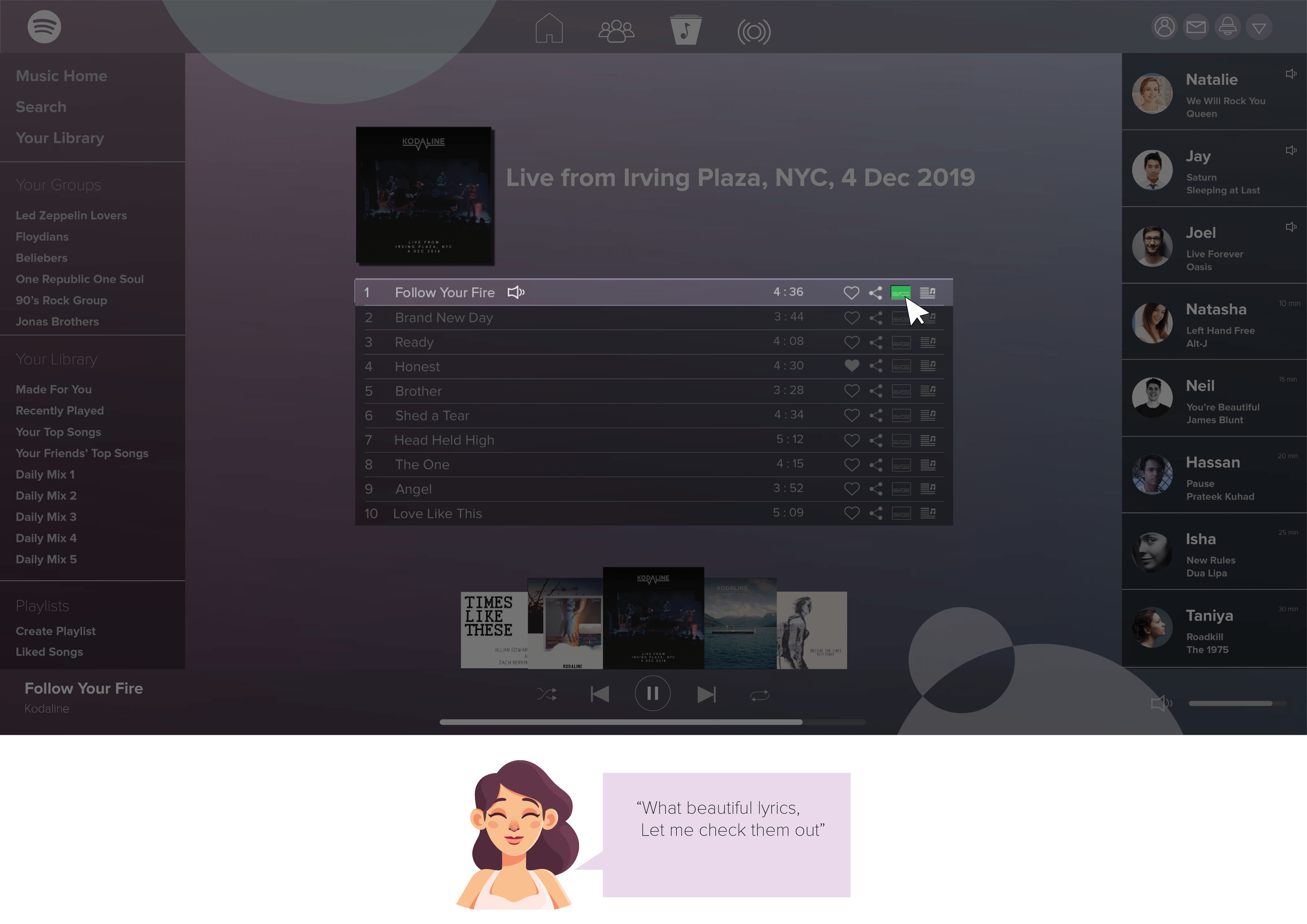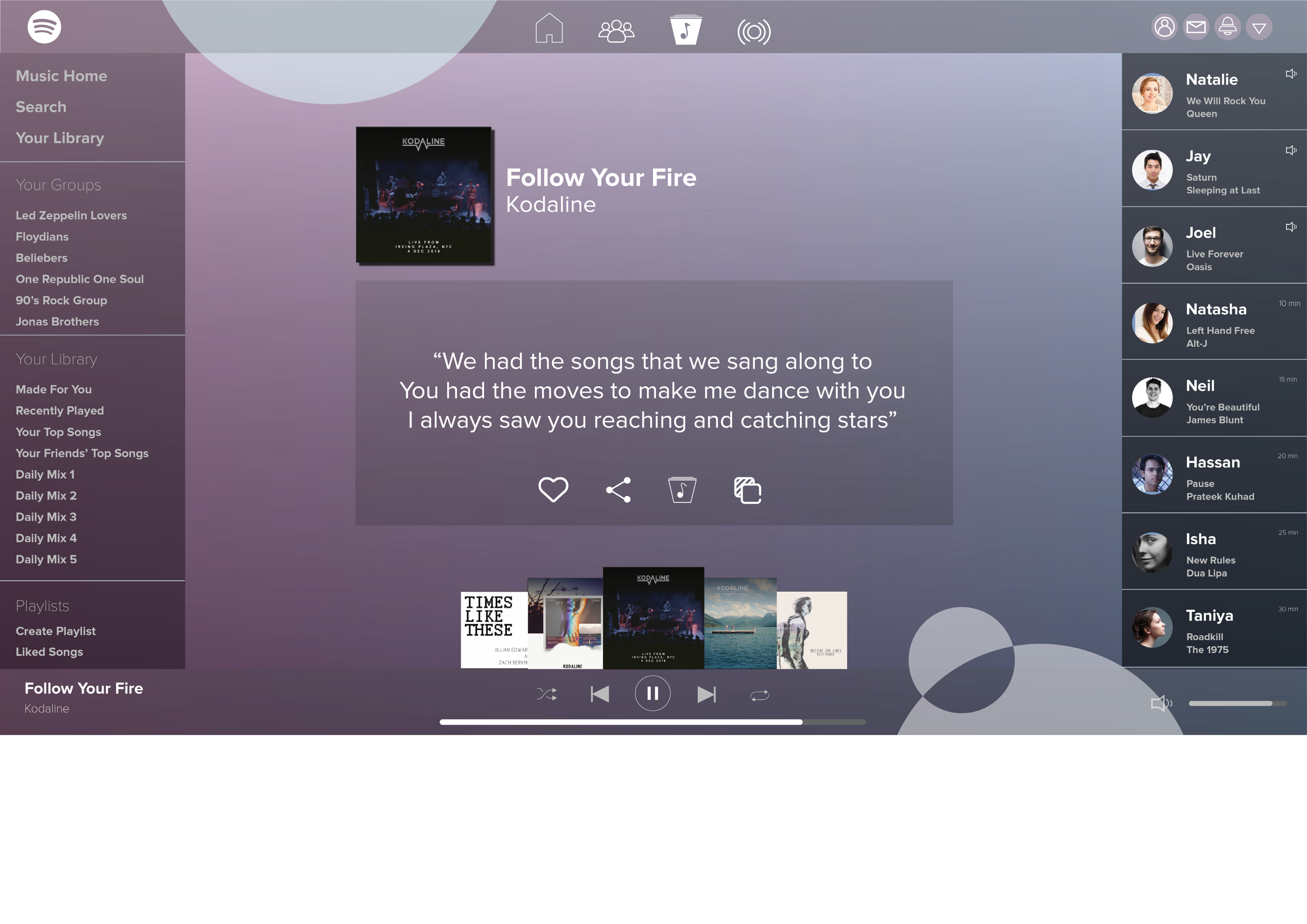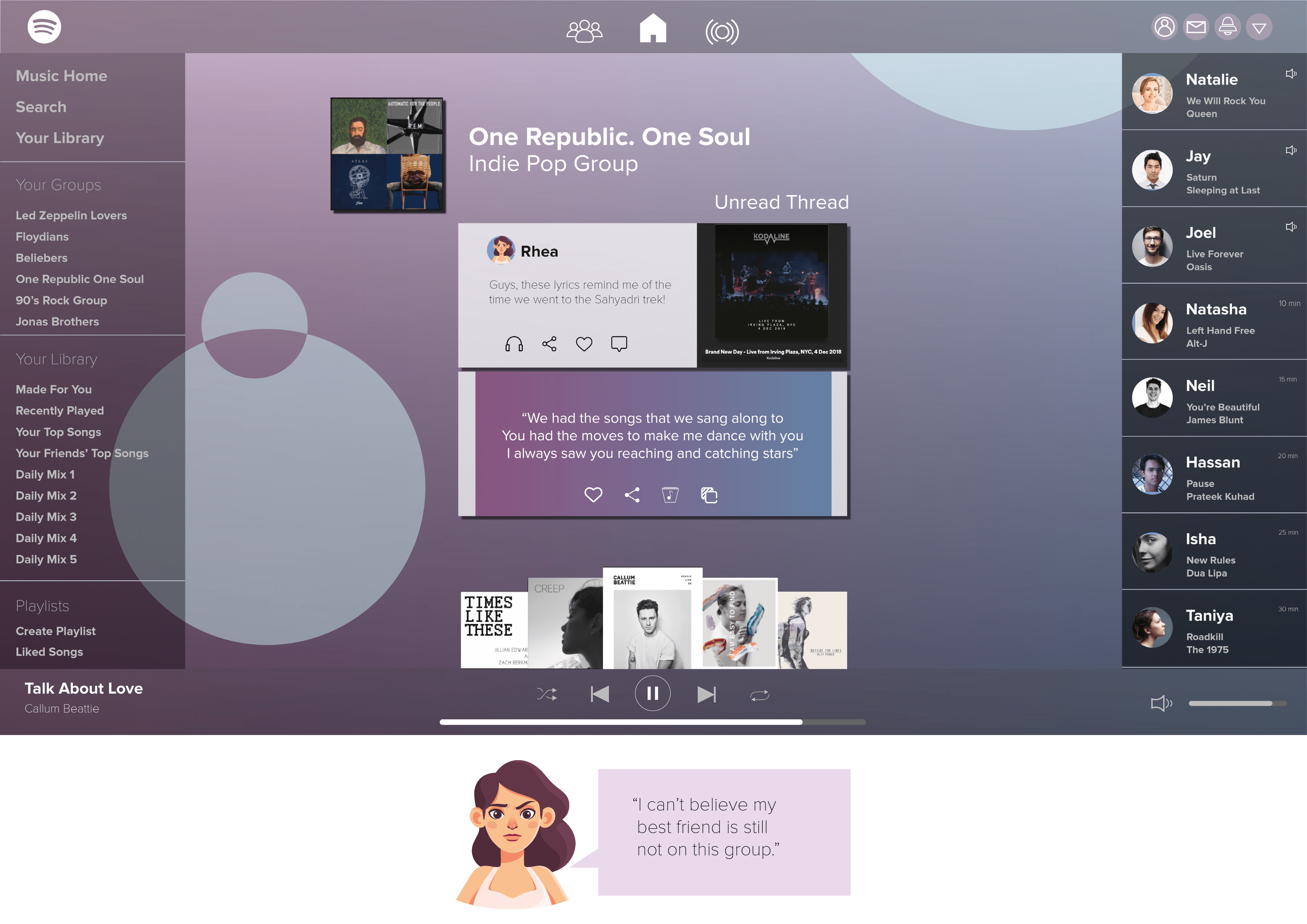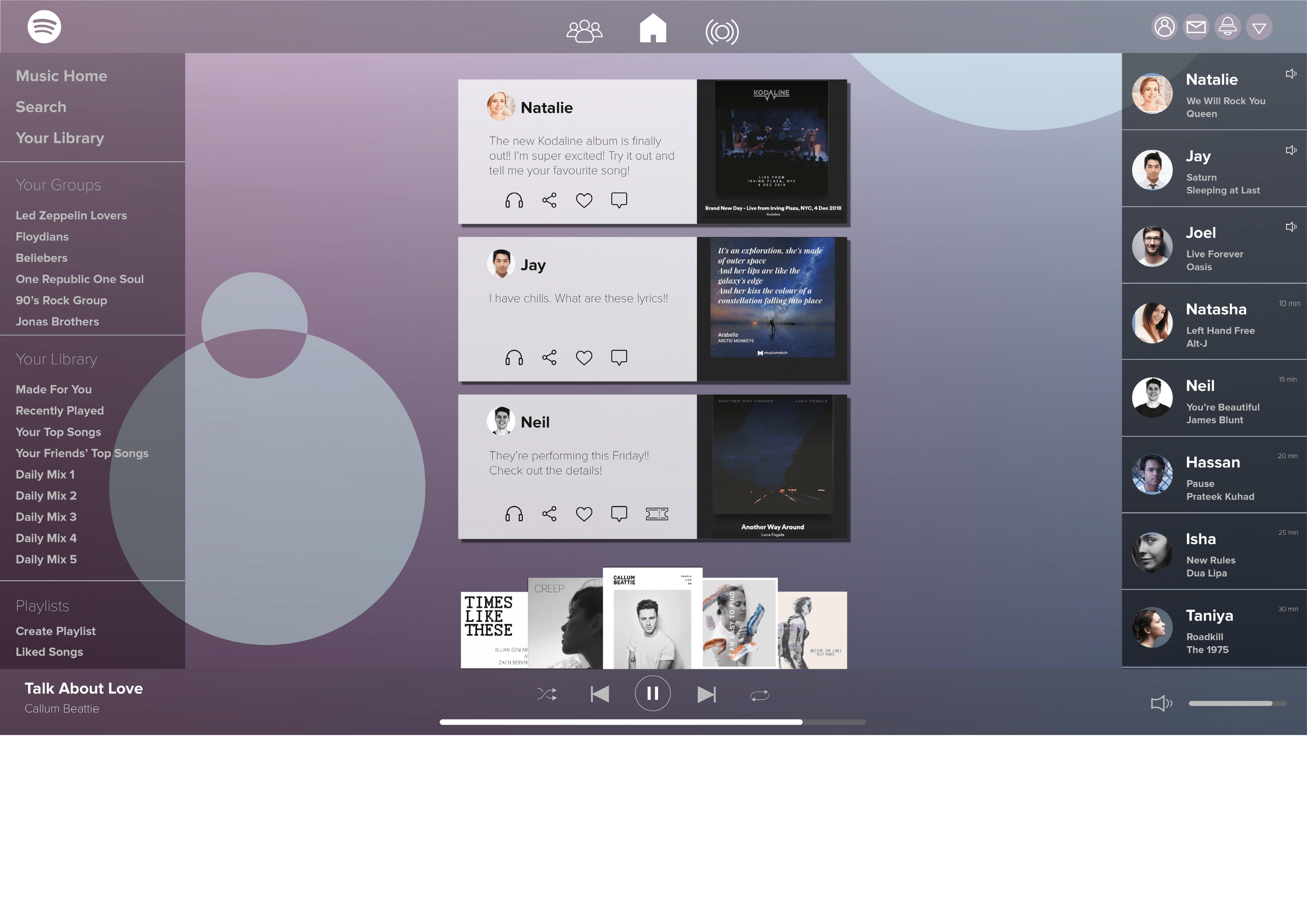 Creating social media-like features such as spotify user-feeds, spotify stories, spotify social groups, spotify messaging, lyric sharing, trivia sharing and so on